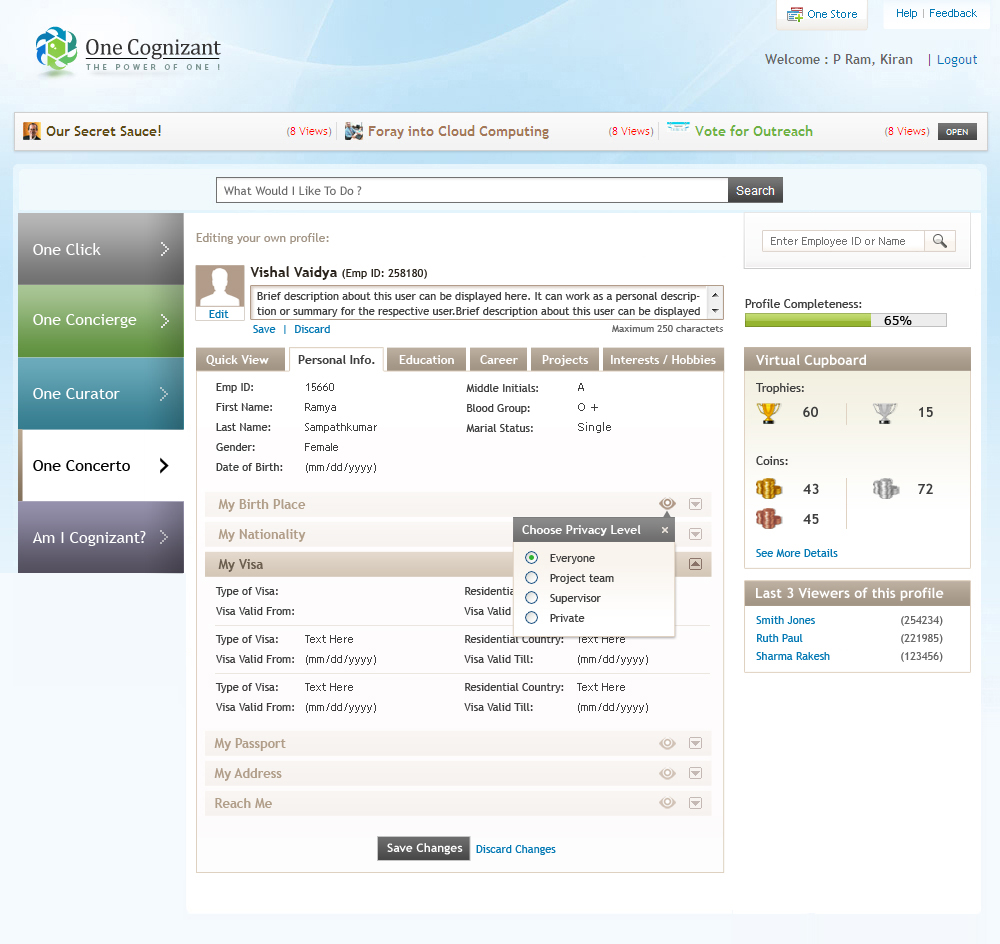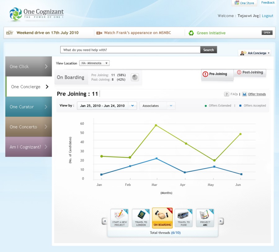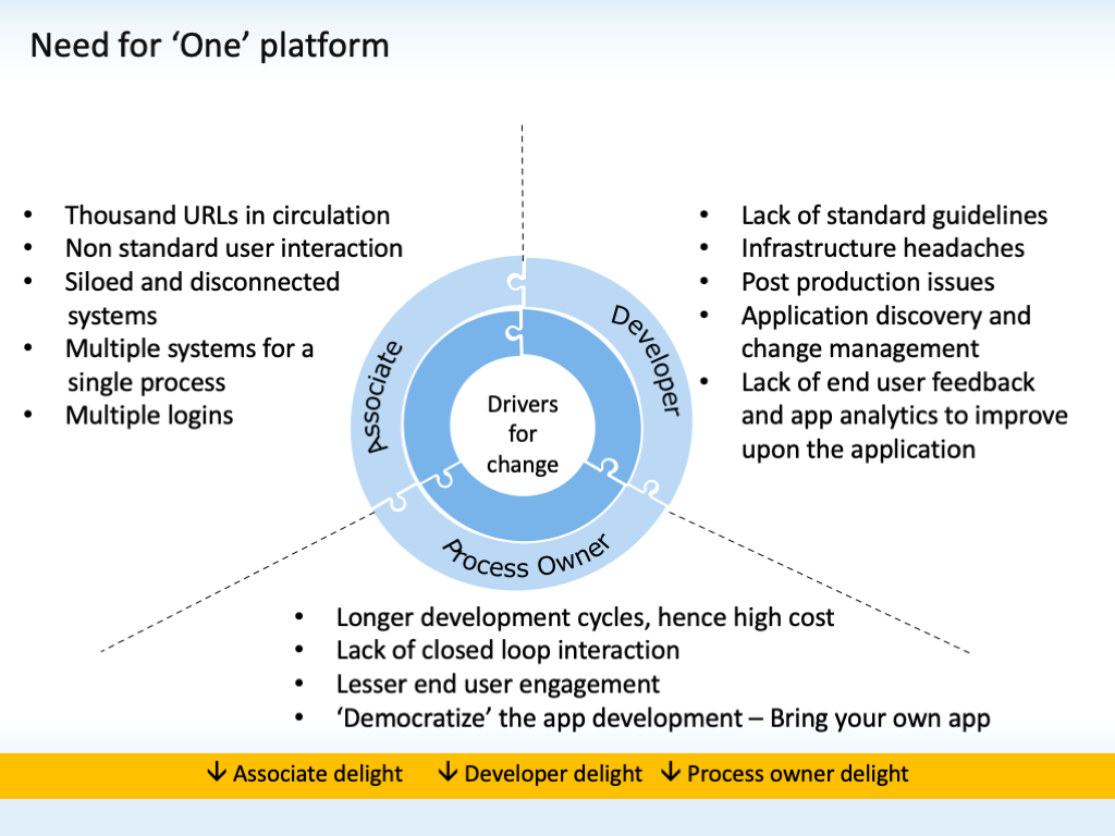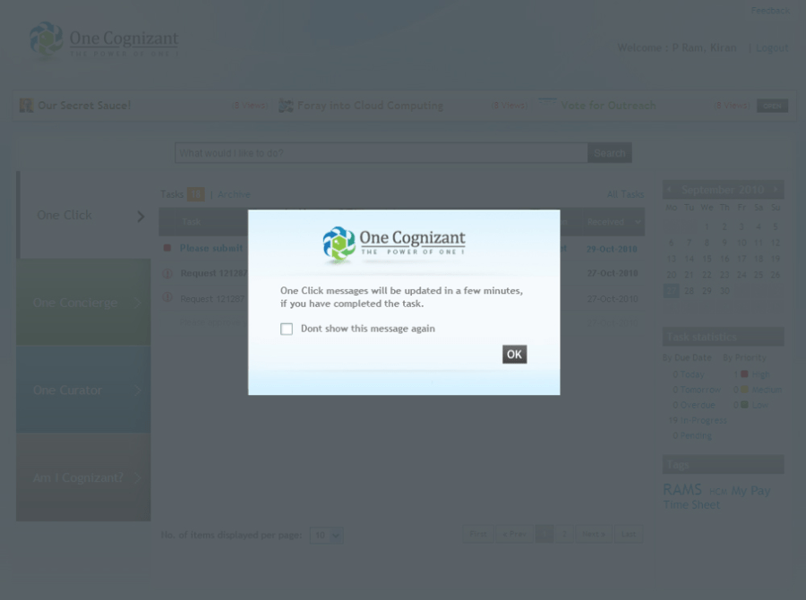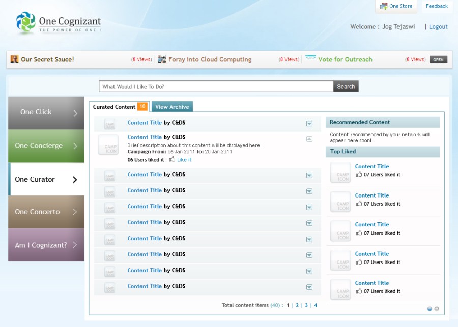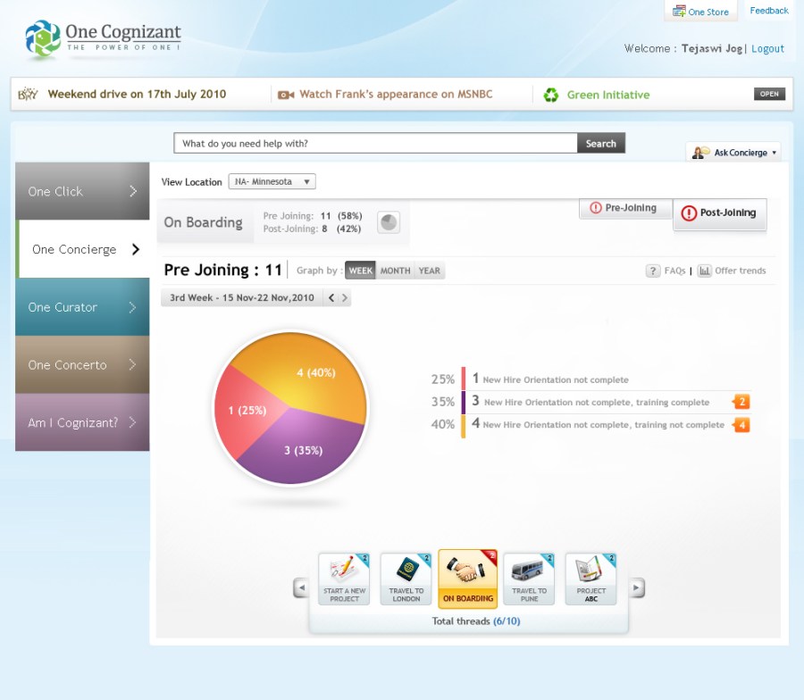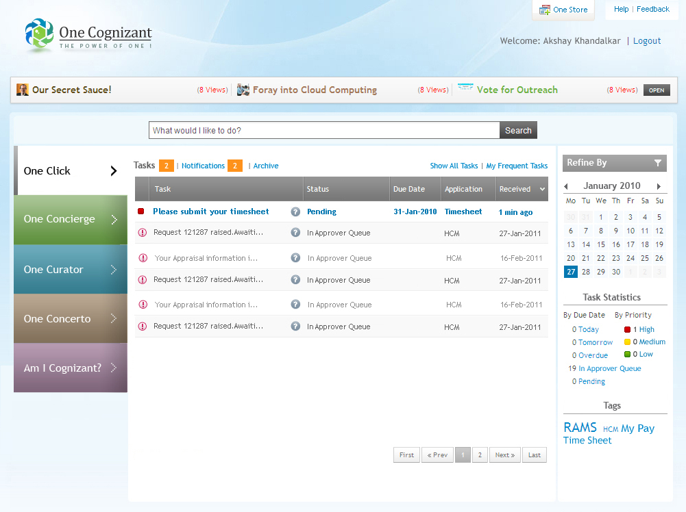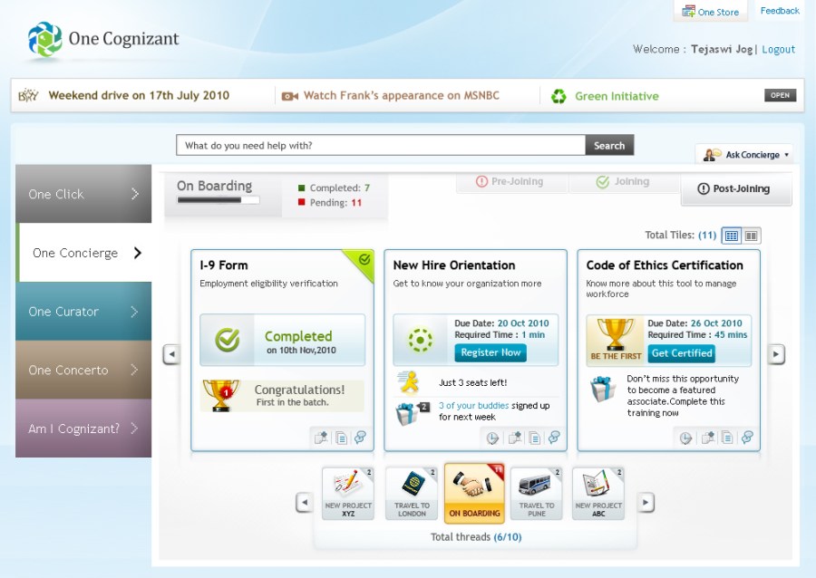 One Cognizant is a corporate initiative to integrate all Cognizant internal applications on a single platform with an objective to enhance productivity, performance, and user experience for its 156,700+ employees.