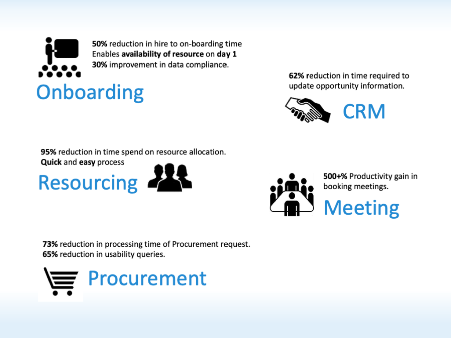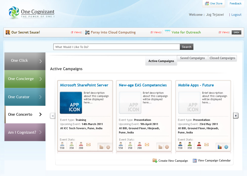 The One Cognizant Platform enables employees to work more virtually and collaboratively and to share knowledge, insights, and experiences across the company’s global enterprise. This platform gives 156,700+ users highly responsive apps developed specifically to achieve 500 percent or more productivity gains while requiring minimal email alerts, training, and change management. It also enables an easy-to-use on-ramp for users to get tasks done through a single URL, thereby eliminating the need to bookmark multiple URLs for various applications. It also standardizes the method of user experience and user interface, which improves user productivity through an intuitive use of UI and usability. The One Cognizant Platform was built using the latest versions of the Microsoft stack and the latest principles of scalable architecture.